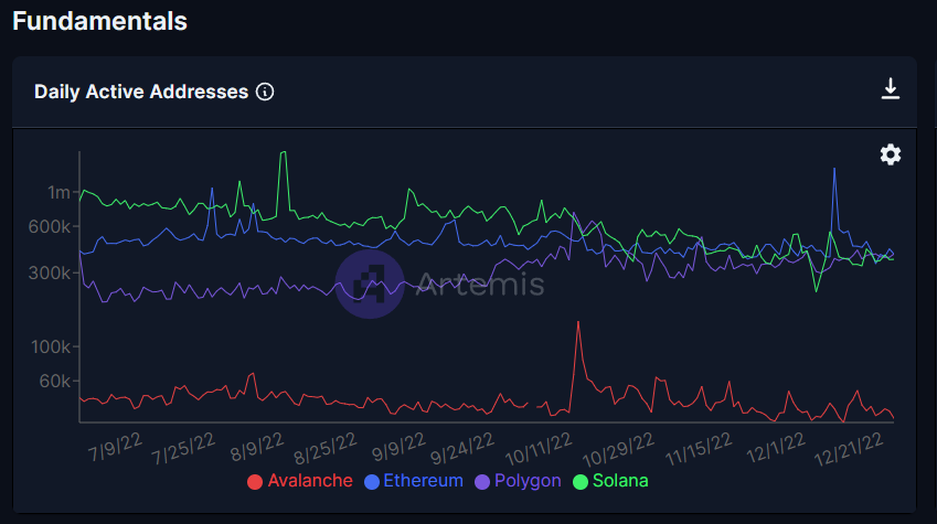 Daily active addresses have increased 42%, from 227,000 to just under 400,000, sine July 1st 2022. Nearly all other L1s have seen their daily active address numbers decrease in 2H 2022.